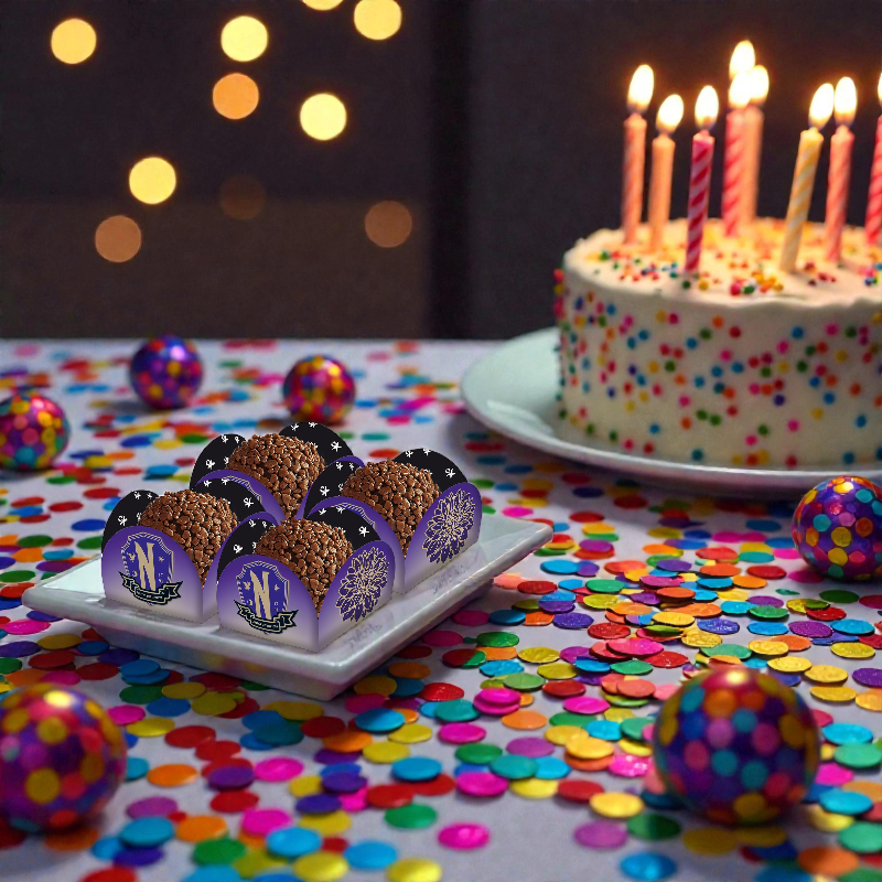 Com a decoração de festa inspirada na personagem Wandinha Addams, este item é indispensável para fazer da sua comemoração um sucesso entre crianças e pré-adolescentes. Com o tema gótico, macabro e inteligente da família Addams, sua festa se tornará empolgante e única. As 40 unidades de porta forminhas são feitas em Papel Off Set e possuem o tamanho aproximado de 8x8cm, ideal para acomodar doces de maneira prática e temática.