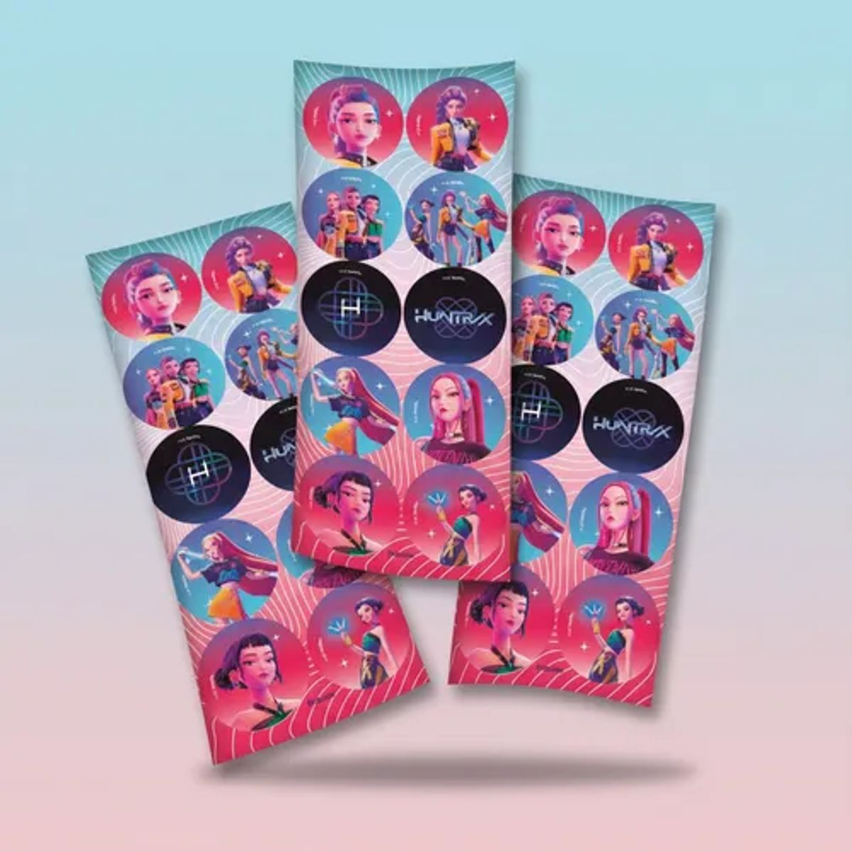Cada adesivo redondo possui um design cativante, com cores vivas que destacam o tema Guerreiras do K-Pop.