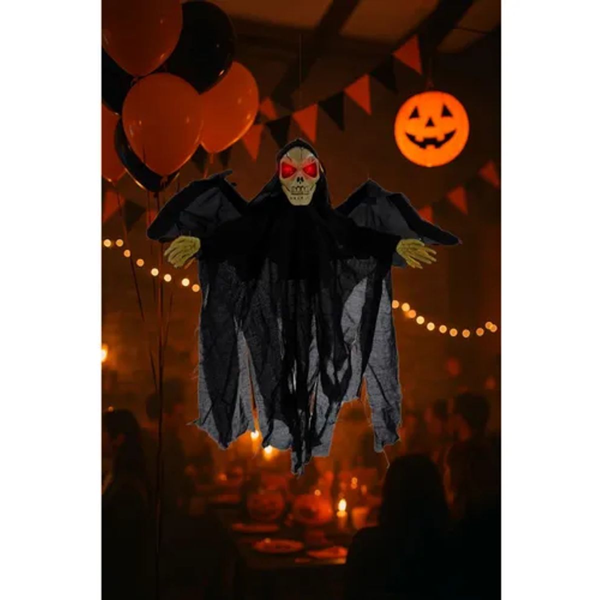 Decoração versátil, ideal para pendurar ou posicionar em mesas e cantos, adaptando-se a diferentes estilos de decoração de Halloween.