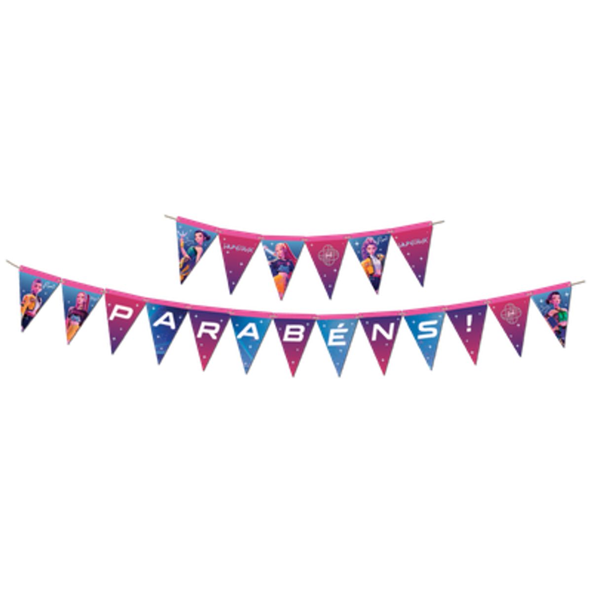 Esta faixa decorativa é essencial para criar um ambiente festivo e imersivo, combinando perfeitamente com outros artigos de festa da linha Guerreiras do K-Pop.