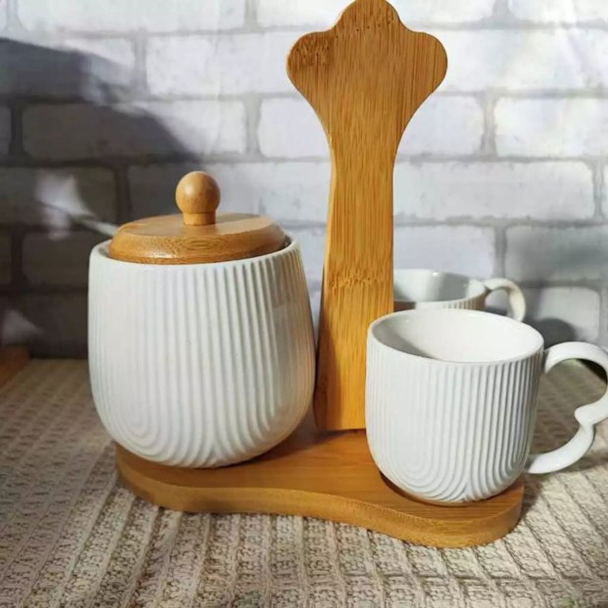 As xícaras possuem o tamanho ideal para o café, enquanto o açucareiro com tampa mantém o açúcar protegido e acessível.