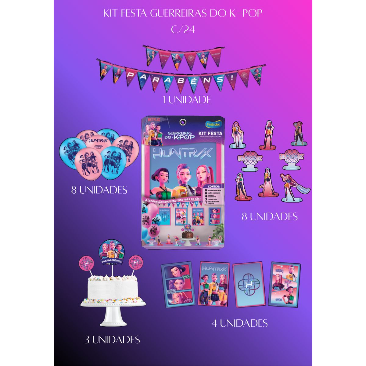 Kit completo com 24 itens, ideal para uma decoração de festa coesa e sem preocupações.