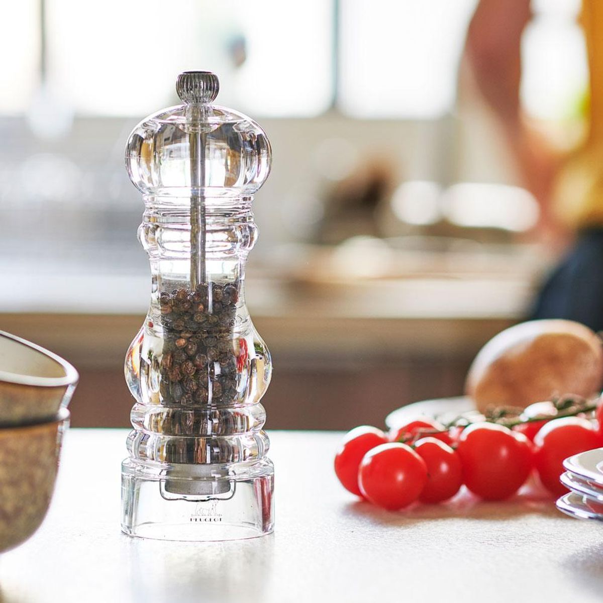 O corpo transparente do moedor permite identificar facilmente o tempero e saber o momento ideal para o reabastecimento.