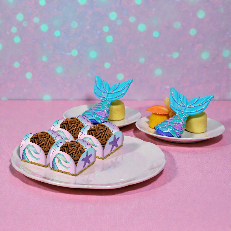Além de decorar a mesa de doces, as forminhas podem servir como suporte para brigadeiros, beijinhos, e outros docinhos de festa. Com o tema sereia, é possível criar uma atmosfera única e encantadora, ideal para festas infantis, chás de bebê, e outros eventos especiais.
