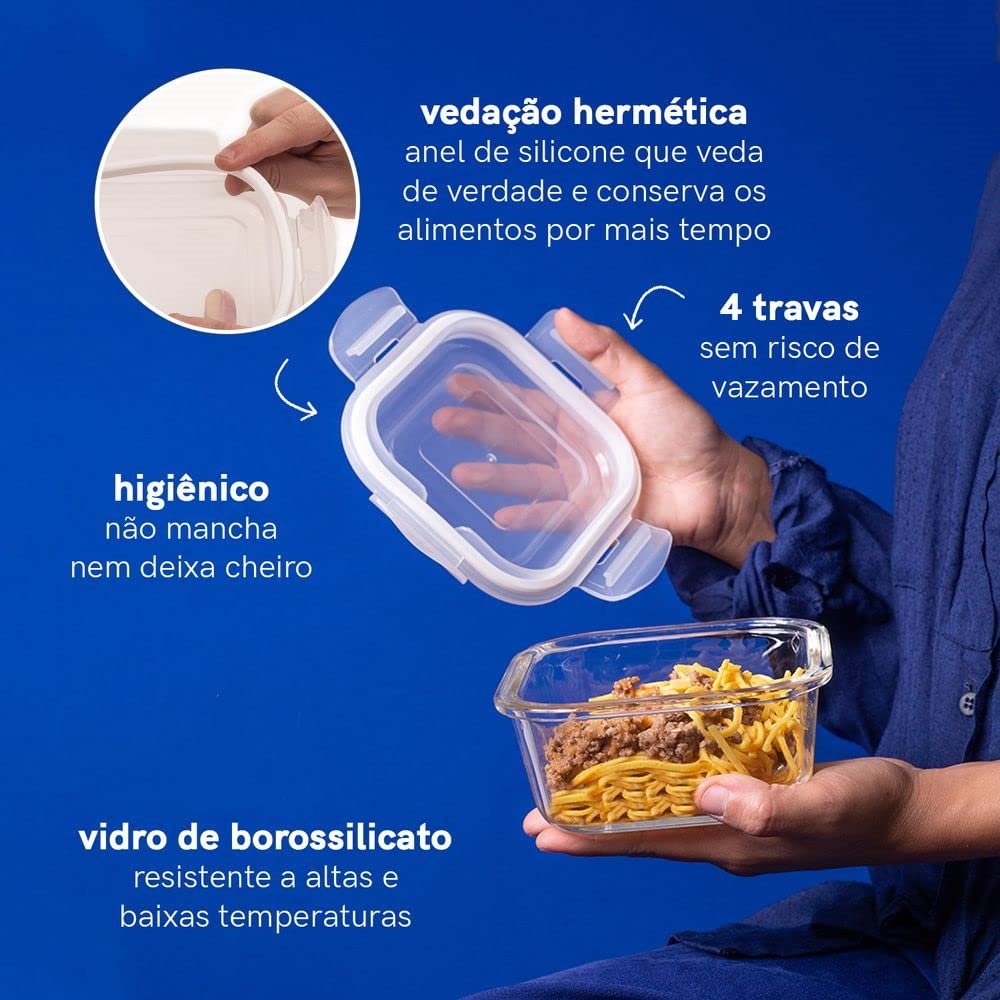 Vedação hermética superior: Mantenha seus alimentos frescos e protegidos contra vazamentos com o anel de borracha natural e fecho de metal robusto.
