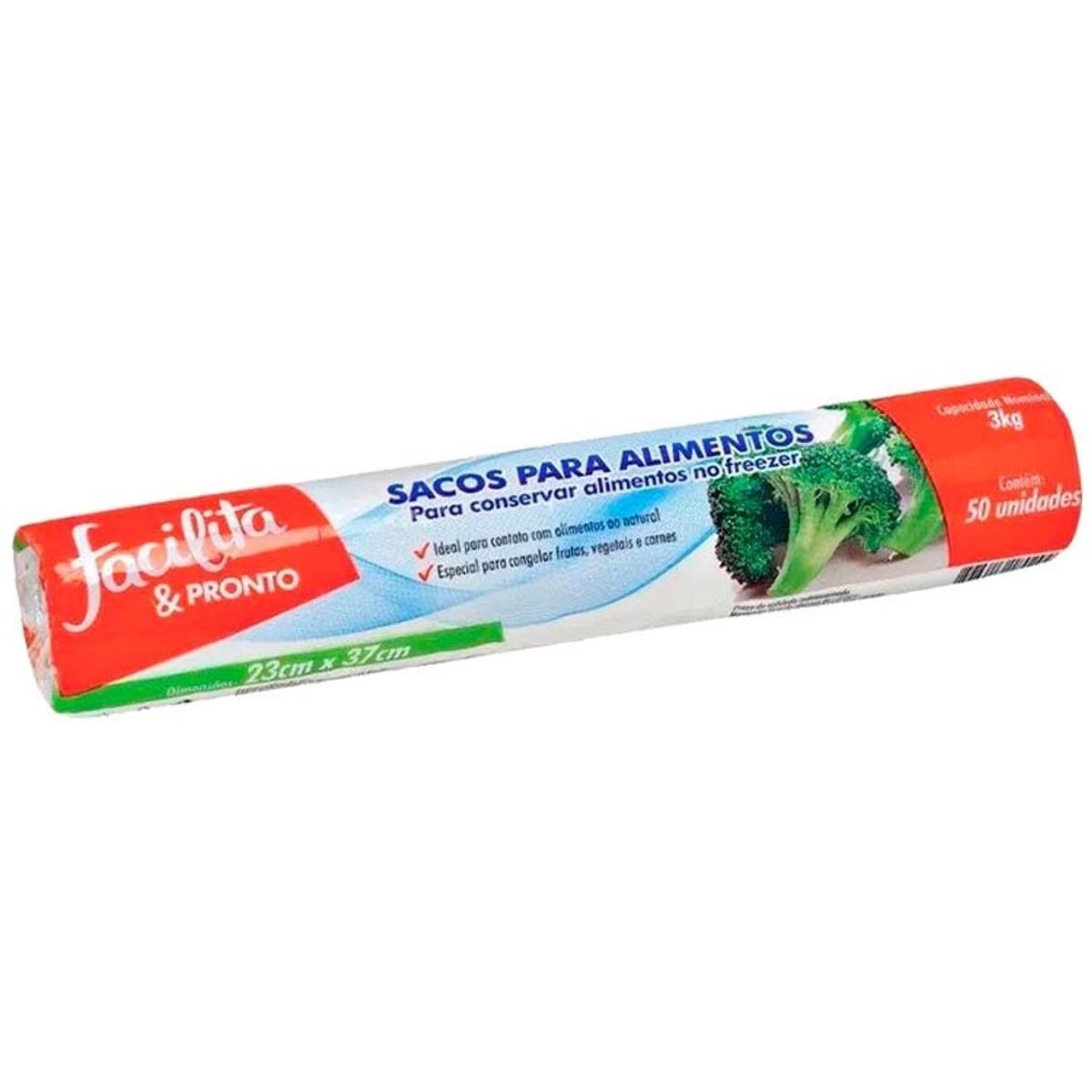 Embalagem econômica: Contém 50 unidades de Sacos para Alimentos Facilita, oferecendo excelente custo-benefício para uso contínuo.